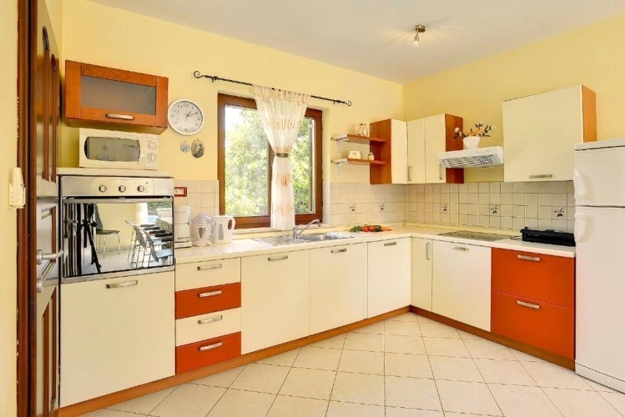 La casa è composta da 2 piani, al piano terra si trova un ampio soggiorno con camino, una sala da pranzo con cucina e un bagno. Dal primo piano si accede ad un ampio terrazzo coperto, dove si trova anche una cucina esterna. Al primo piano ci sono tre camere da letto, un ampio bagno e un balcone.